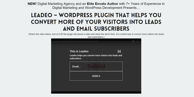 Leadeo is a WordPress plugin that helps you to increase conversions on your landing page. It does that by pausing the video on your landing page, and showing an opt-in (or contact) form at the exact time you select. (More forms are coming soon.)